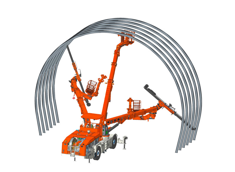 雙鑿巖拱錨臺(tái)車融合拱架施工與錨桿施工為一體,適應(yīng)各種規(guī)格鋼拱架安裝、錨桿施工、輔助裝藥平臺(tái)、輔助撬毛和通風(fēng)管作業(yè)等多功能,滿足在鐵路、公路隧道內(nèi)安裝單榀/多榀鋼拱架的規(guī)范性及安全性要求,滿足單洞單線、雙線、三線單次開挖(全斷面、臺(tái)階法)一次性鋼拱架安裝距離要求。