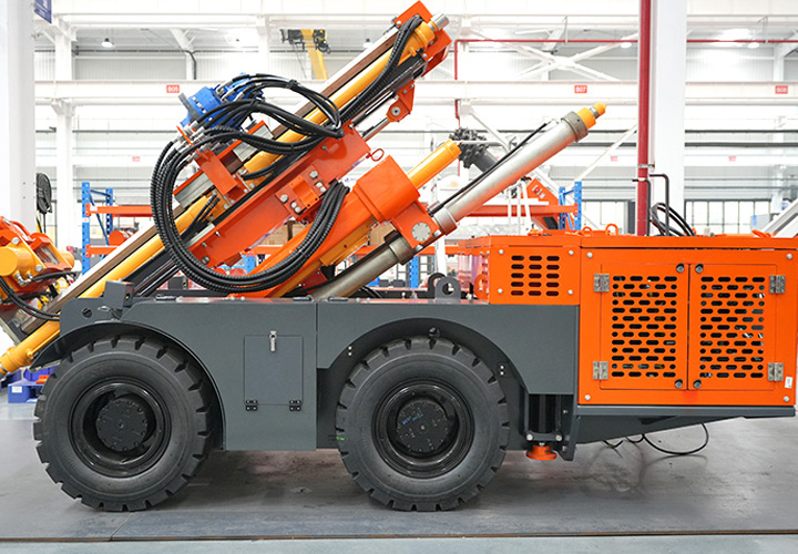 KODT-125是一款輪胎式礦用潛孔鉆機(jī),電壓等級:380V,采用潛孔沖擊器作業(yè),閉式四驅(qū)液壓系統(tǒng),適用于3.3-4m地下采場環(huán)形孔的穿鑿,是專用的穿孔設(shè)備,也可用于天井和斜井的開鑿及回采作業(yè)。主要功能和裝置如下:適用于鉆孔直徑范圍120-254mm,鉆孔深度0-100m;鉆架可環(huán)向360°旋轉(zhuǎn),前后-10°-55°度擺動,適用于環(huán)向打孔;鉆臂裝載有液壓穩(wěn)桿機(jī)構(gòu),保證鉆孔直度,偏斜率≤1%;機(jī)身配有頂升支腿和后擺動橋,可在路面坑洼惡劣條件下工作;設(shè)備四驅(qū)驅(qū)動,可實(shí)現(xiàn)360°轉(zhuǎn)彎,原地掉頭;長距離移動時,設(shè)備可解鎖制動,且配備牽引,方便使用拖車進(jìn)行快速移動;鉆機(jī)回轉(zhuǎn)具有無級調(diào)速功能,可根據(jù)不同巖層狀況調(diào)整鉆速,提高效率;且設(shè)備配置遙控裝置,方便操作人員操作設(shè)備的同時,提高了操作安全性和可靠性;設(shè)備配備了沖洗裝置,方便操作人員清理設(shè)備,維持設(shè)備整潔,提高設(shè)備使用壽命。